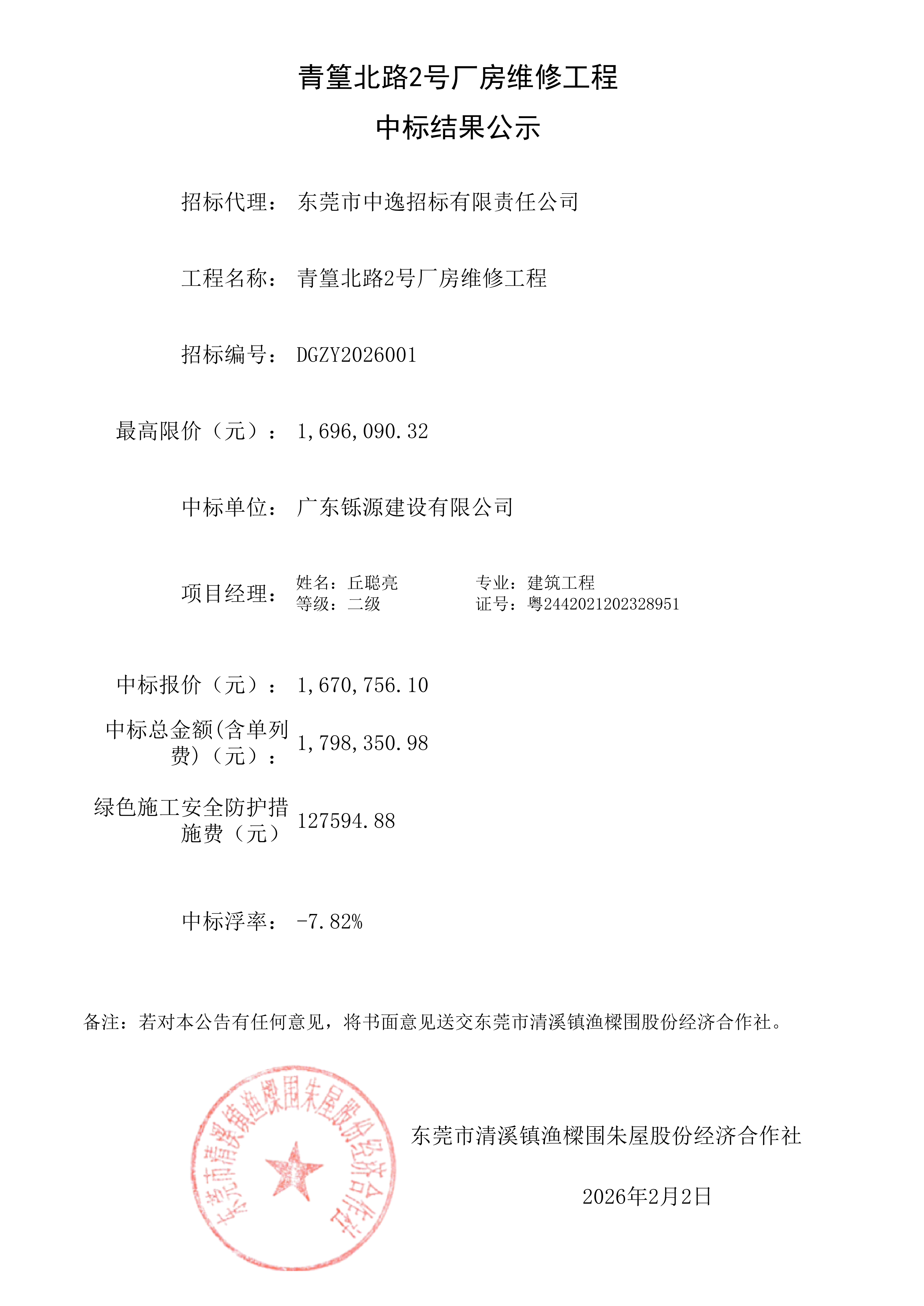 青篁北路2号厂房维修工程中标结果公示